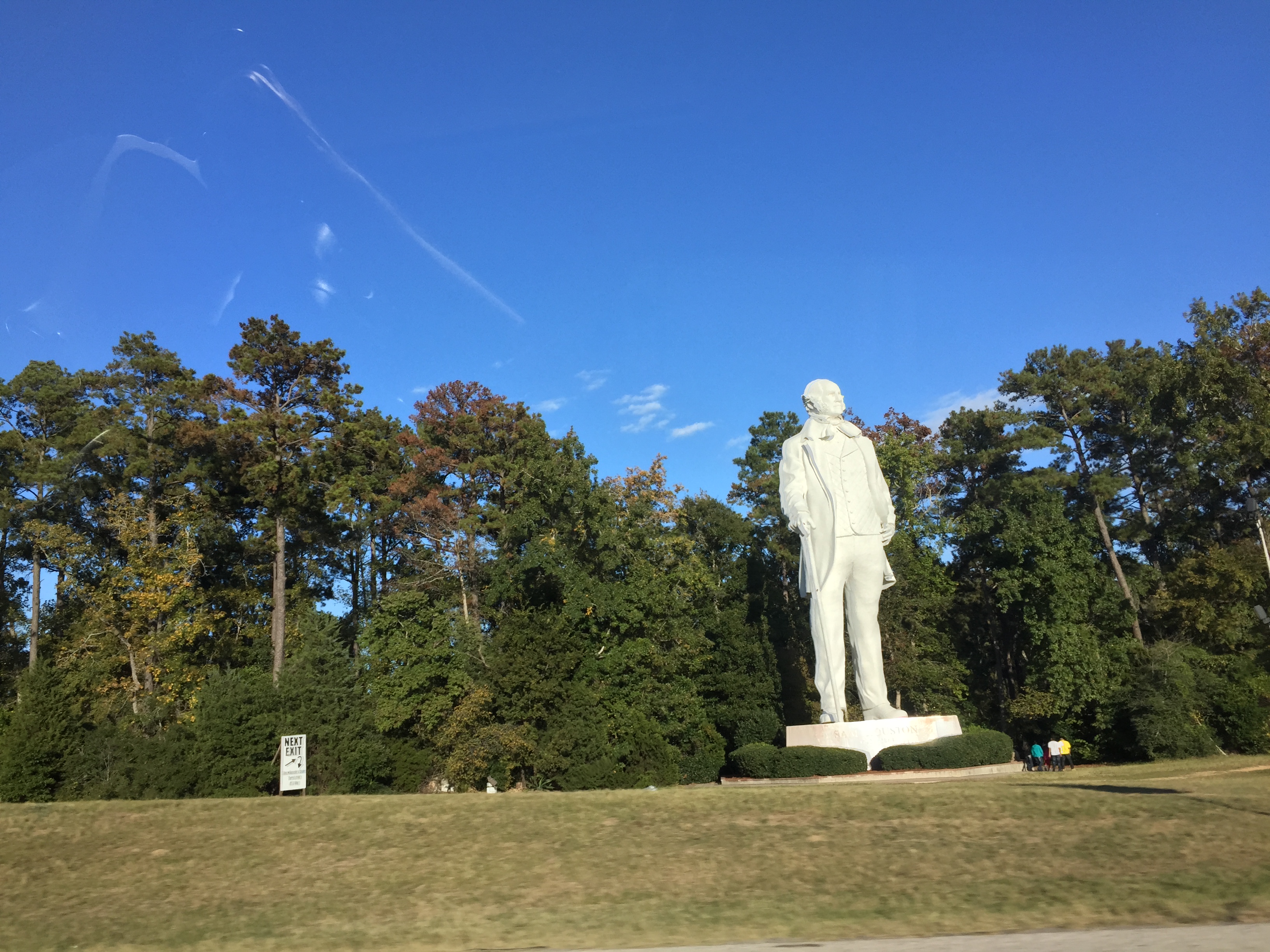 Once it was all over, we were on our way home. After a 35 minute detour, we finally made it to the highway, and after a bit I looked out at all the lovely tall trees surrounding us on both sides of the road on such a pretty day and asked my hubby “Aren’t these beautiful?” “Hmm,” was his reply. It seems he was getting a little claustrophobic after a while and felt the trees were falling in on him. There were tons of pine trees and a bunch of others I couldn’t recognize. Turns out we were driving through the Sam Houston National Forest. Suddenly, after a turn in the road, we see this big honkin’ statue, taller than the trees. It was a statue of Sam Houston himself. Awesome to see, and I had to wonder how it was transported there. I was able to snap a few pictures (please pardon the window glare), and this break in the trees caused my hubby to feel a little less closed in.